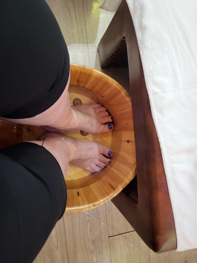 Op de terugweg dacht ik aan de blogs van schoondochter Eva, die in Thailand is. Zij heeft zich regelmatig laten verwennen door een (voet) massage. Daar waren mijn voeten ook wel aan toe! Het kostte de dames niet veel moeite me over te halen om een combi met rugmassage en scrubben van de voeten te nemen. Geheel buiten mijn comfortzone heb ik nog afgedongen ook 💪. Helemaal fris en fruitig liep ik na anderhalf uur weer naar buiten.