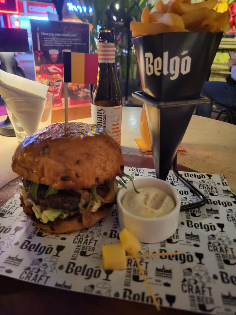 Voor het avondeten liep ik wat door de buurt te struinen en keek waar de meeste mensen zaten te eten. 1 restaurant was goed bezet met locals en toeristen. Bleek een Belgisch bierrestaurant 🍺 Ik verzin het niet! Nou vooruit, omdat ik morgen op een toer naar de Mekong Delta ga en lokale hapjes en drankjes ga proeven, mag het vandaag. Compleet met Liefmans en Belgische mayonaise. De frietjes heb ik grotendeels laten staan hoor en ik heb ook geen Belgische wafel als toetje genomen. Iets met koolhydraten 🫣.