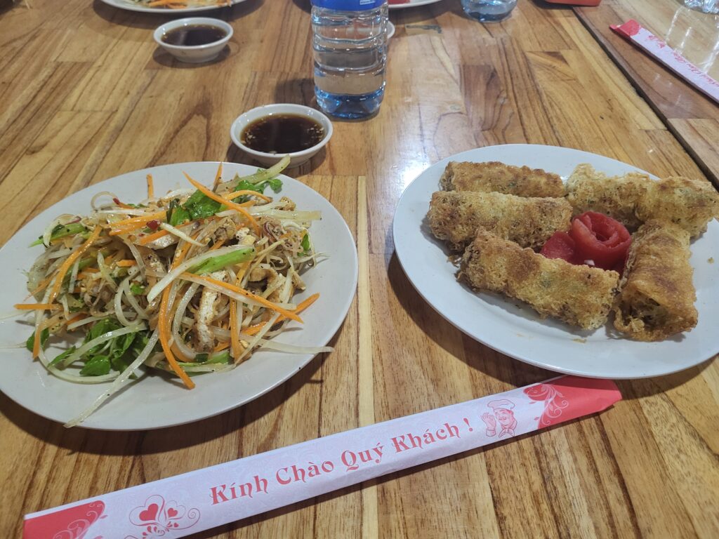 Vanmiddag werd ik bij mijn hotel opgehaald voor een kookles + tochtje in een mandboot. We gingen eerst naar de markt, waar we diverse groenten, kruiden en fruit te zien kregen, met uitleg over smaken en hoe je kunt zien of je een vrucht in een salade moet gebruiken (nog fris en hard) of als dessert (zoet en zacht). Uiteraard kon ik dat bij veel dingen wel zelf bedenken, maar dat je bij drakenfruit/pitahaya aan de buitenkant kunt zien of de binnenkant roze of wit is, vanwege stand van de blaadjes, wist ik niet. Natuurlijk mochten we ook heerlijk vers fruit proeven.