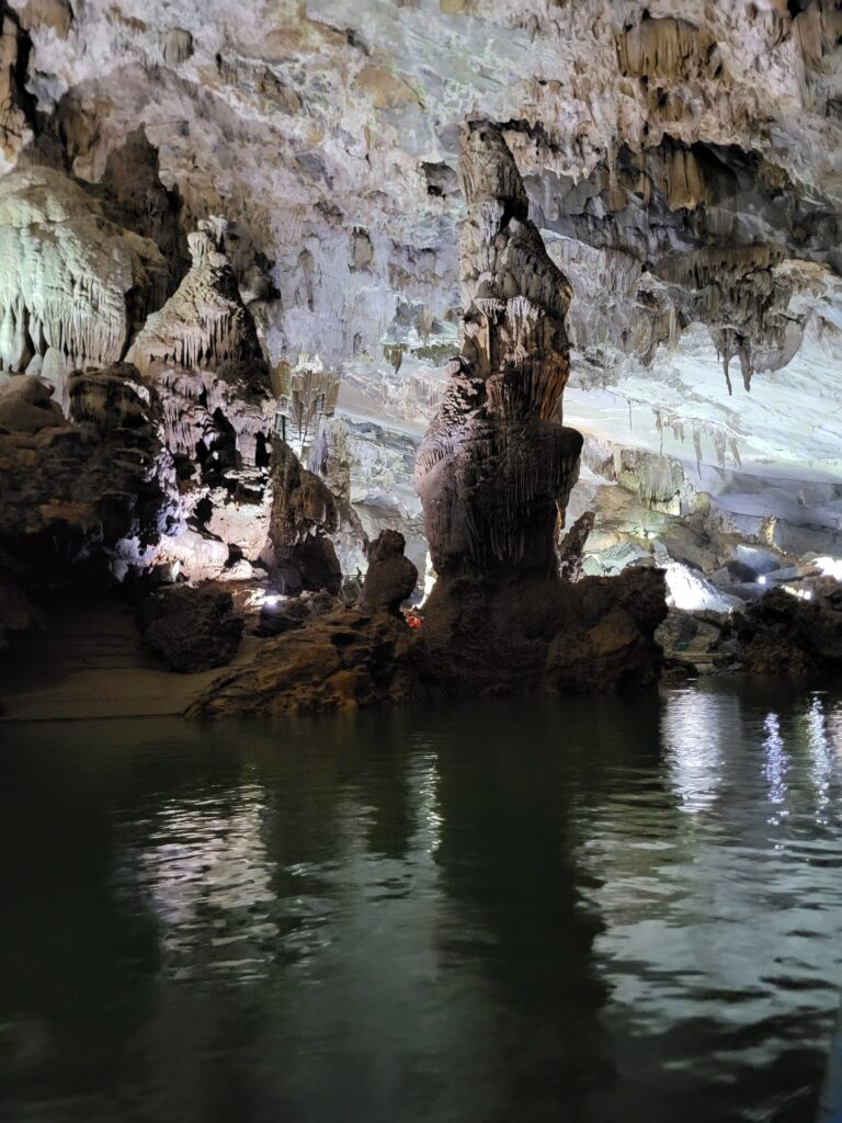 Vanaf de ingang van de grot ging je met houten trappen naar beneden. Dan loopt er verder een houten vlonder met wat zijtakjes. Prachtige stalagmieten en stalactieten, gekleurd door verschillende mineralen. Je voelt je echt nietig als je hier doorheen mag lopen. Aan de tour nam ook de Nederlandse Kirsten deel. In de grotten onze verwondering kunnen delen en in de bus lekker gekletst.