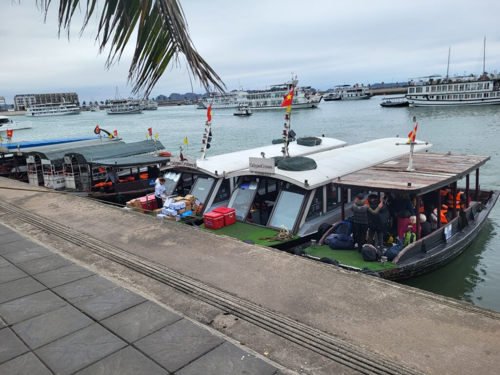 Na een behoorlijke busrit vanaf Hanoi, aangekomen in de haven. Daar gaat iedereen op een “kleine” boot, die je vervolgens naar je cruiseschip brengt. De bus had ons gezelschap ruim op tijd afgezet, dus ik had alle tijd om het komen en gaan te bekijken. Een spektakel op zich! Er zijn tientallen maatschappijen die een- of meerdaagse cruises aanbieden. De transportboten brengen mensen terug en halen nieuwe gezelschappen op. Gelijktijdig nemen ze voorraden mee. Als je het aanschouwt lijkt het een compleet gekkenhuis, maar tegelijkertijd loopt alles bijzonder gestroomlijnd en strak georganiseerd.