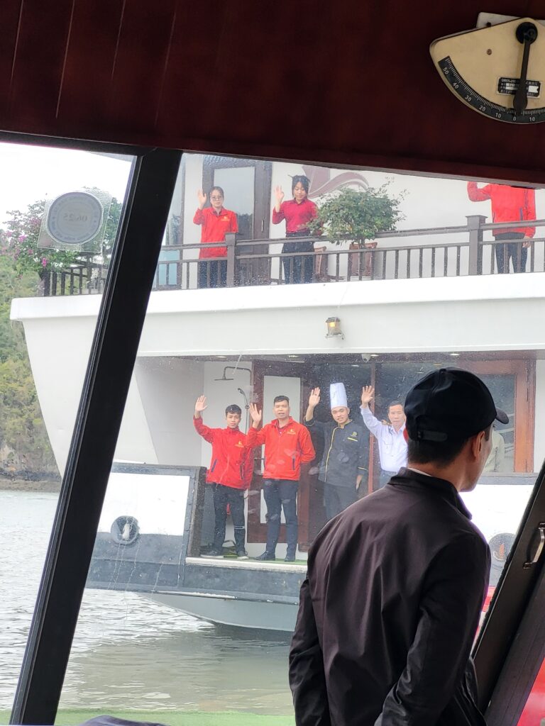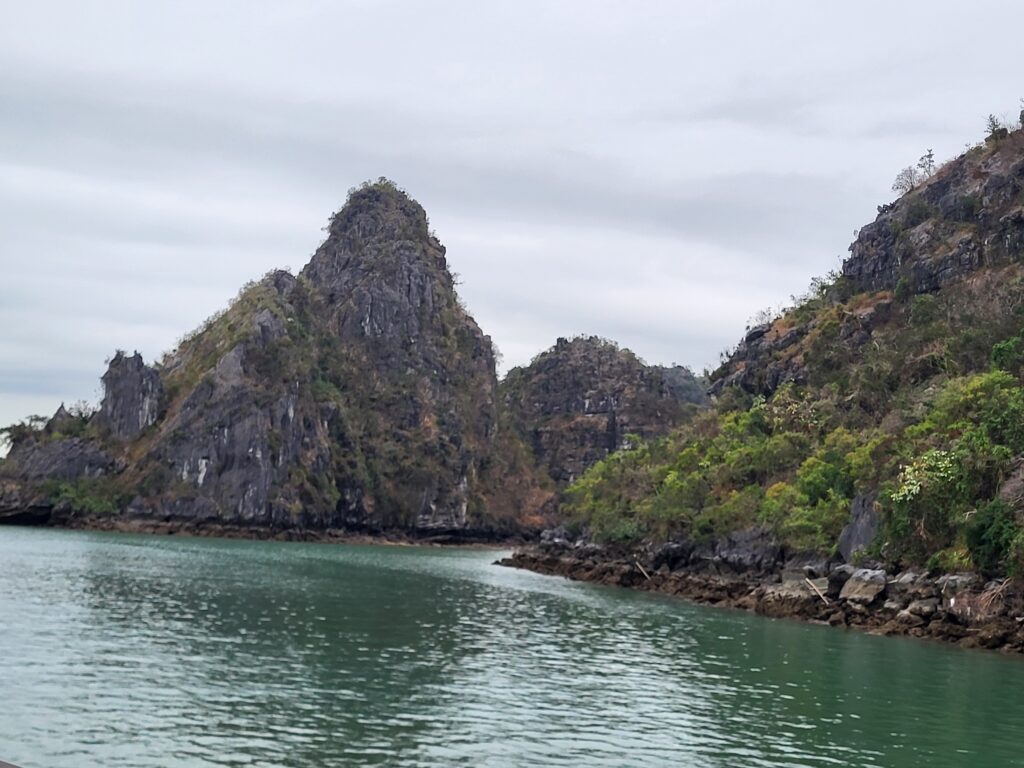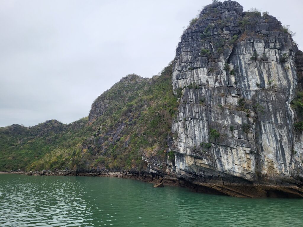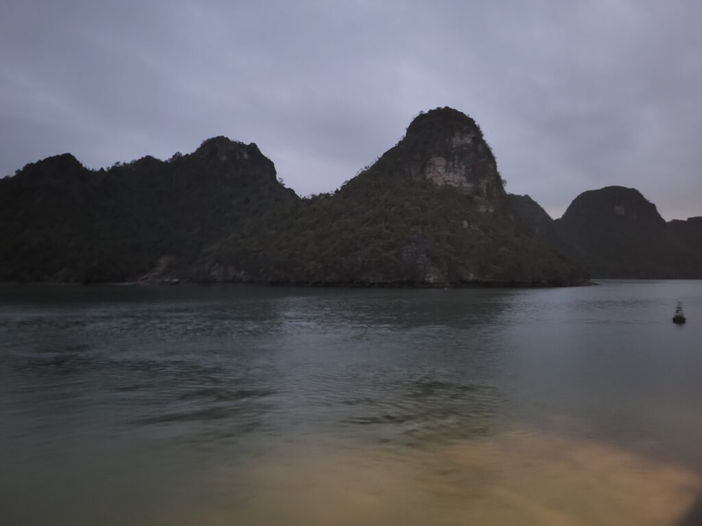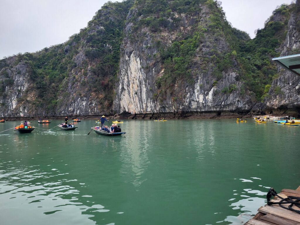 Toen we uit Hanoi vertrokken, regende het en was het mistig. Hier in de baai was het droog, maar wel bewolkt. Het zwemmen heb ik aan me voorbij laten gaan. Zelfs niet in de whirlpool op het bovendek gegaan. Ik heb zelfs een jas aan gehad voor het eerst sinds ik in Vietnam ben 😄.